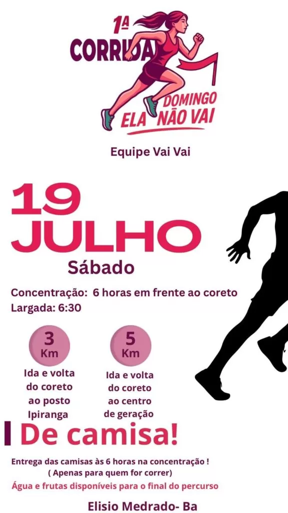 A cidade de Elísio Medrado vai sediar a 1ª Corrida “Domingo ela não vai” organizada pelo grupo de corrida de Elísio Medrado “Equipe Vai Vai” com concentração em frente na Praça Gil Procônio Lapa em frente ao coreto com largada às 06h:30min, nas modalidadesc3 km totalizando ida e volta e 5 km percurso ida e volta.