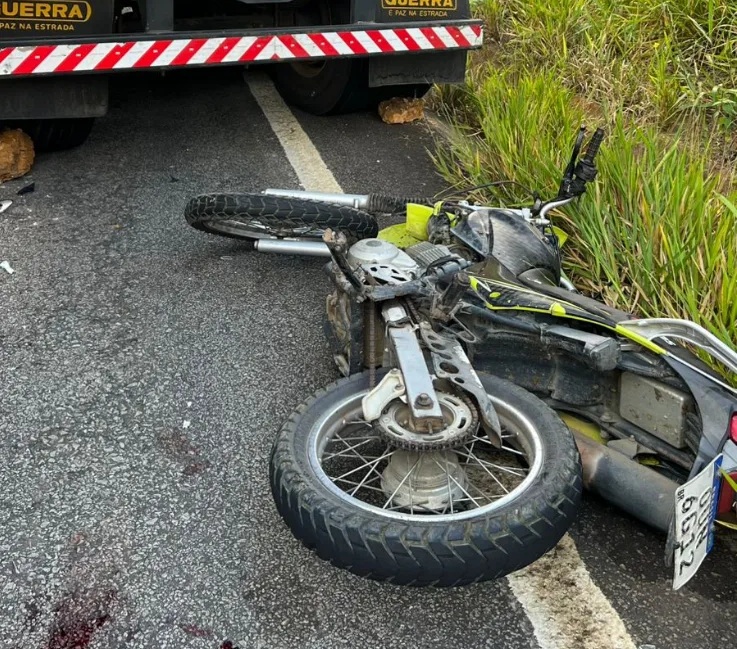 No local, uma motocicleta modelo Honda Bros, de cor verde, aparece parada logo atrás do veículo de carga. Imagens registradas mostram ainda vestígios de sangue sobre a pista, o que levanta a suspeita de que tenha ocorrido um acidente.