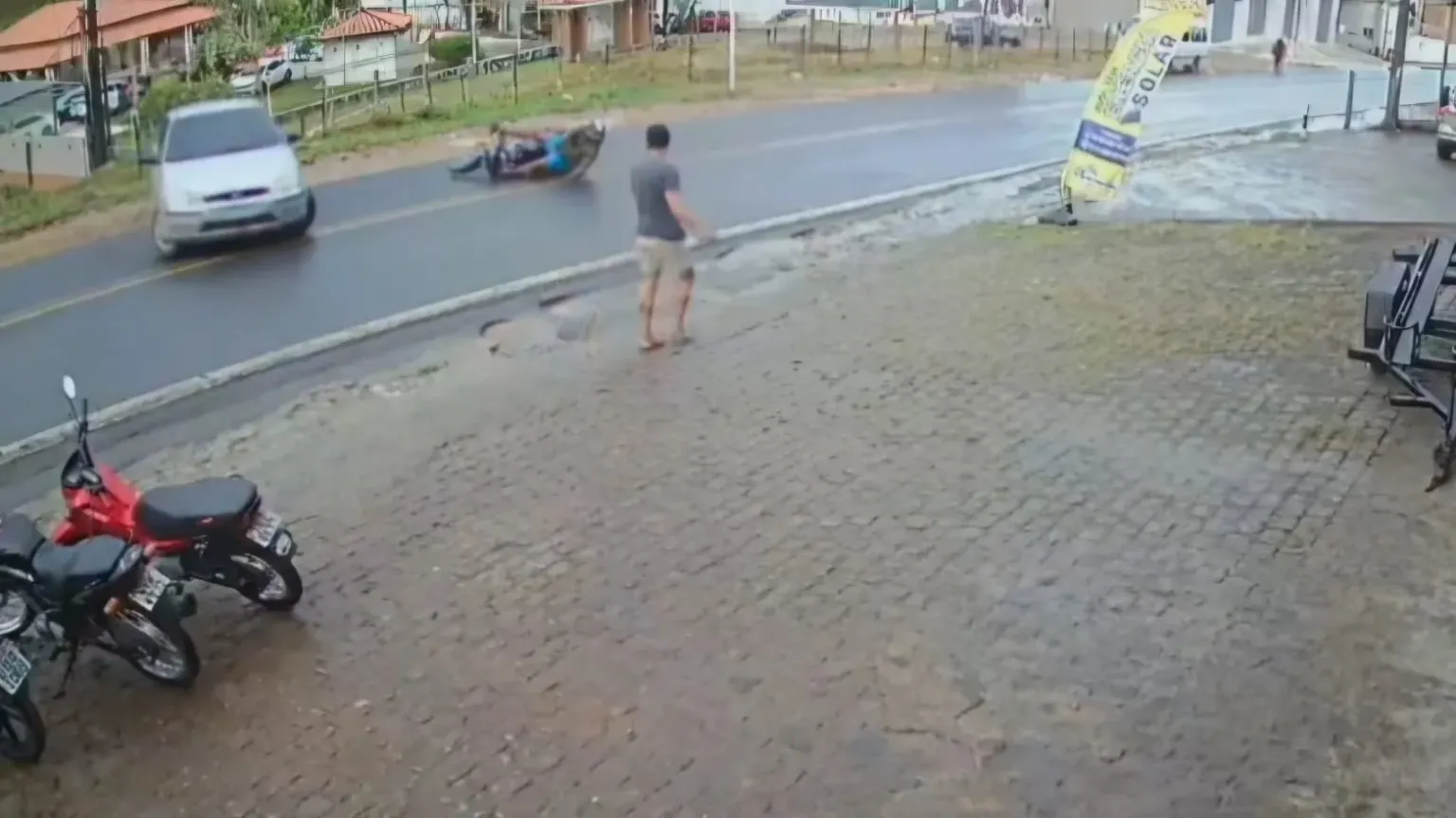 Com a manobra, o motociclista tentou frear bruscamente, mas acabou derrapando, caindo e colidindo na lateral do carro. No momento do acidente, a pista estava molhada, o que pode ter contribuído para a queda.