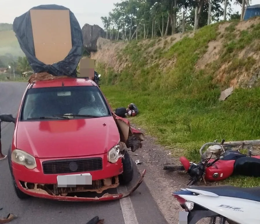 Imagens encaminhadas ao Mídia Bahia mostram a motocicleta na margem da rodovia, enquanto a Strada aparece na contramão na pista de rolamento, com para-lama, farol e para-choque danificados. Aparentemente, houve uma colisão lateral.