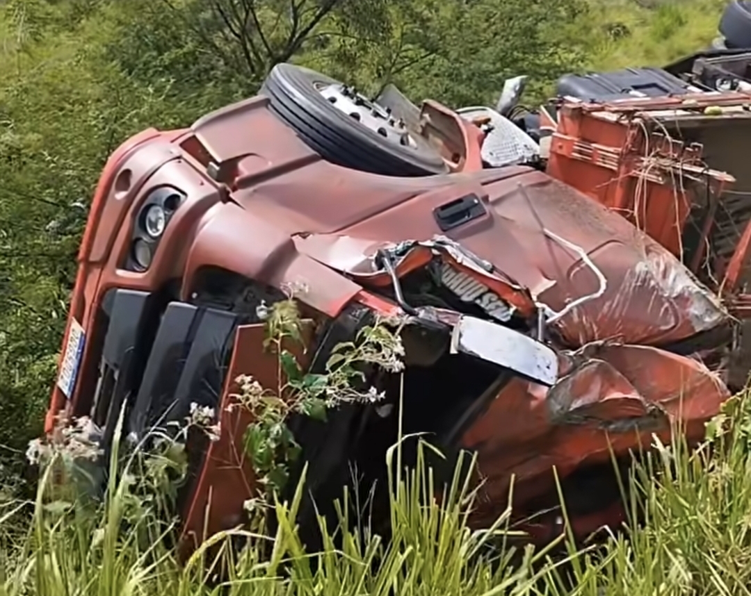 De acordo com as informacões iniciais. o caminhão saiu da pista por motivos ainda não esclarecidos espalhando parte da carga às margens da rodovia. Apesar do impacto, não houve reaistro de vítimas, e a motorista passa bem.
