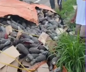 Caminhão carregado de abacaxi tomba na BR-101 em Teolândia