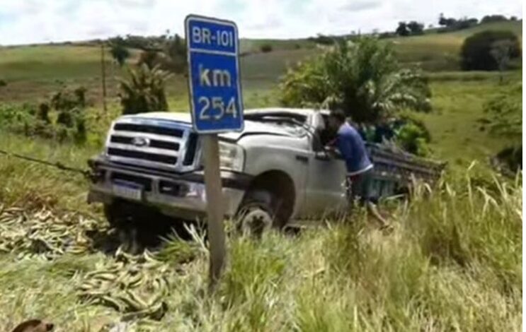 Um caminhão Ford F-4000, carregado com banana-da-terra, capotou na tarde de quinta-feira (19), no km 254 da BR-101, nas proximidades de Santo Antônio de Jesus.