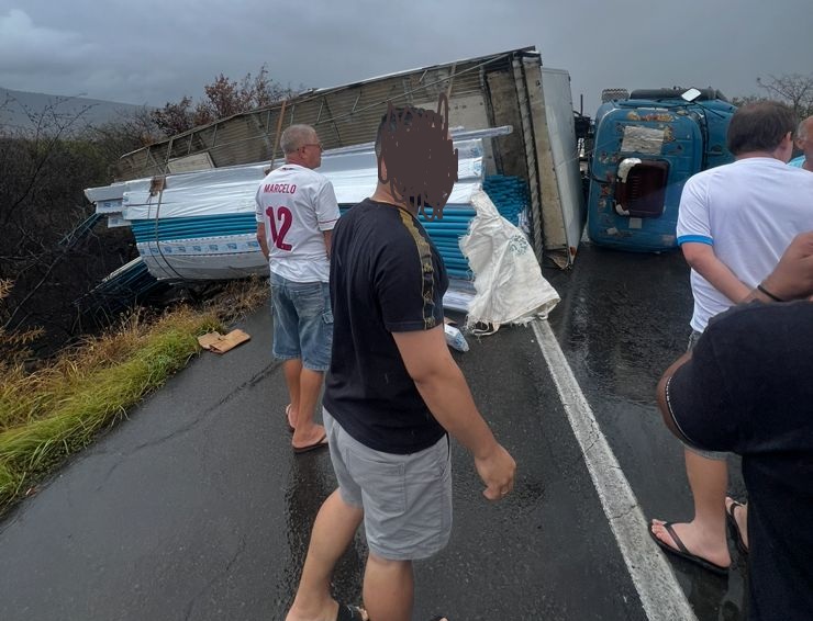 A carreta tombada ocupou grande parte da via, o que causou o engarrafamento que durou horas.