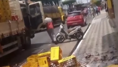 Carga de cerveja cai de caminhão e deixa cacos de vidros em rua no centro de Amargosa