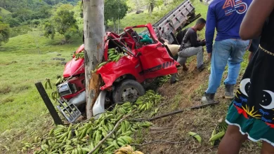 Caminhão carregado de frutas sai da pista após colisão com Fiat Toro na BR-420, em Mutuípe
