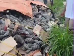 Caminhão carregado de abacaxi tomba na BR-101 em Teolândia