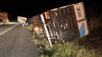 Caminhão tomba na BR-116, no trecho de Jequié; rodovia ficou interditada durante destombamento nesta sexta-feira