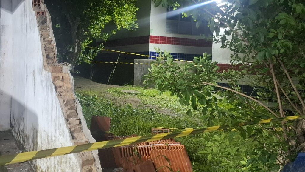 Uma área que restou do muro foi isolada, pois apresenta rachaduras com novos riscos de desabar.