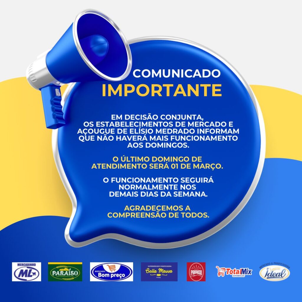Com a mudança, os estabelecimentos seguirão atendendo normalmente de segunda a sábado, mantendo os horários habituais já praticados. A orientação é que os consumidores se programem para realizar suas compras com antecedência.