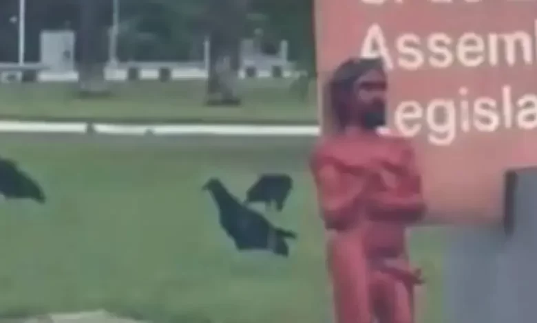 A obra ganhou repercussão nesta terça-feira (11), após um vídeo viralizar mostrando um motorista que, ao passar pelo local, se surpreende com a figura e a descreve como uma representação do “diabo”, questionando sua presença em um espaço público e o fato de a peça exibir o órgão genital.