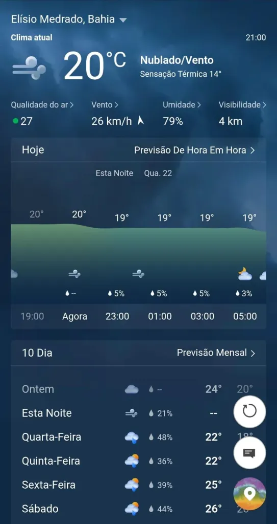 Mesmo após ter terminado o inverno, e agora em plena primavera quando as temperaturas tendem a aumentar em toda a região, em Elísio Medrado, os termômetros registraram 20°C na noite desta terça-feira (21), com a sensação térmica mais baixa ainda em decorrência dos ventos gelados acompanhados de rajadas chegando a apenas 14°C, resultante de uma frente fria que tem mudado clima em grande parte da Bahia.