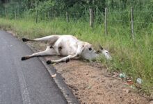 Policiais militares foram acionados por moradores da região e, ao chegarem ao local, encontraram o animal já sem vida e com diversas perfurações, nos fundos da residência.