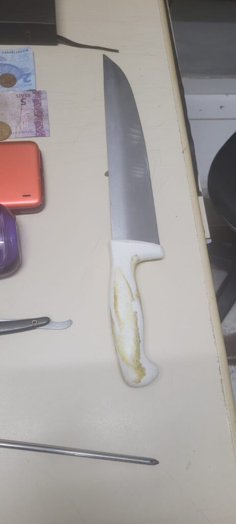 A equipe de jornalismo também teve acesso às imagens dos objetos que estavam em posse do suspeito no momento da ação, incluindo a faca utilizada no crime. Todo material foi devidamente registrado e integra o inquérito que segue em andamento.