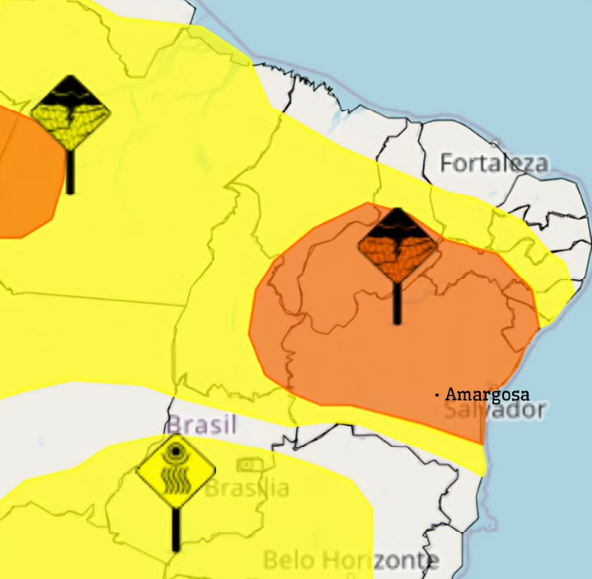 O INMET emitiu na manhã desta quinta-feira (20,) um alerta atualizado e elevado para nível LARANJA (PERIGO) envolvendo todo o Vale do Jiquiriçá e grande parte da Bahia.