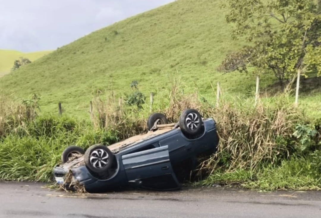 O veículo fivou com as quatro rodas para cima no acostamento da rodovia.