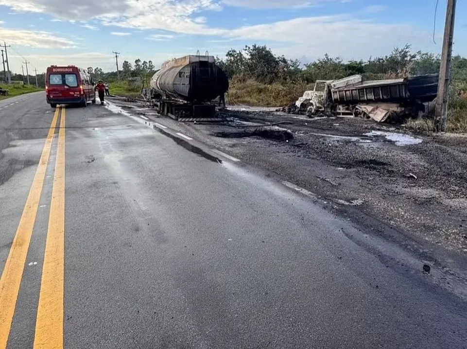 A colisão entre um caminhão-tanque e uma caçamba, na madrugada da quinta-feira, 22, na BR-402, próximo ao povoado Alegria, na cidade de Primeira Cruz, região dos Lençóis Maranhenses, resultou na morte do motorista Paulo Roberto. Natural de Primeira Cruz, era ele quem conduzia o veículo tanque, que explodiu após a batida. As chamas também atingiram a caçamba.