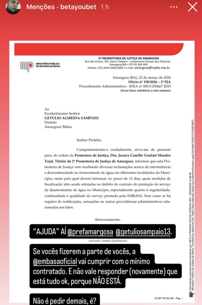 Até o momento, a Prefeitura de Amargosa e a EMBASA não se manifestaram oficialmente sobre o teor do ofício.