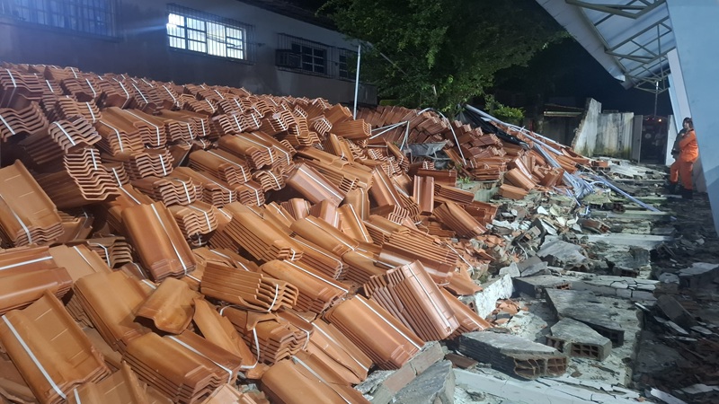 Cerca de 30 metros de cumprimento por quase 3 de altura do muro foi ao chão em decorrência de uma grande quantidade de telhas estarem encostadas no mesmo para realização de uma obra na unidade escolar.