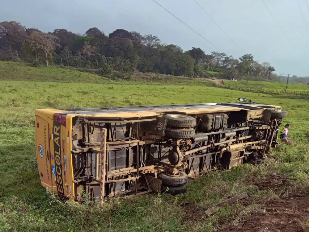 Um ônibus Amarelinho, do programa Caminho da Escola, tombou na tarde deste domingo (24), em Maraú, no sul da Bahia. O veículo transportava jogadores para o povoado de Tabuleiro.
