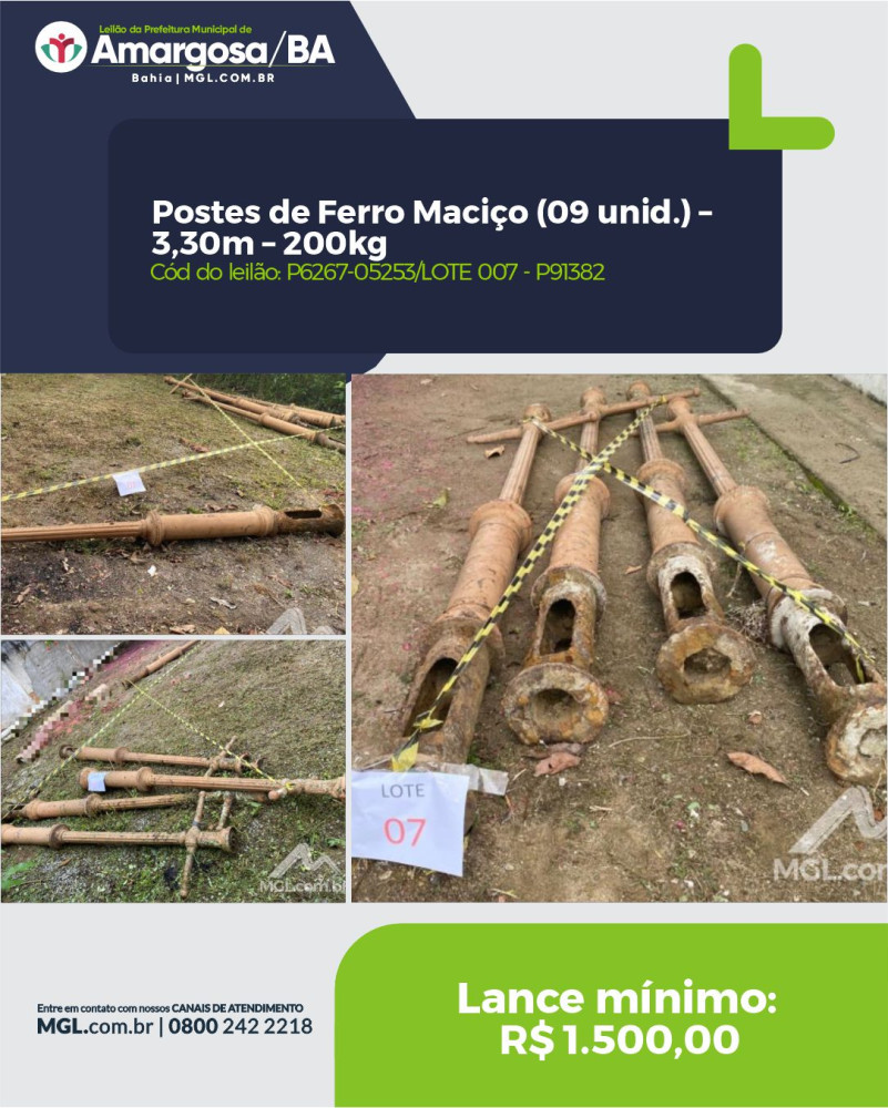 A Prefeitura Municipal de Amargosa, vai realizar, no dia 11 de agosto, o Leilão Público nº 001/2025, às 14h, através do site www.mgl.com.br . O leilão será conduzido pelo leiloeiro Fernando Caetano Moreira Filho e tem como objetivo a venda de bens móveis em desuso, inservíveis e obsoletos pertencentes ao município.