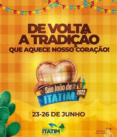 Depois de dois anos sem São João, a Prefeitura de Itatim, divulgou, nesta segunda-feira (11/04), as atrações confirmadas para as festanças de 2022. O evento acontecerá por quatro dias consecutivos, entre os dias 23 e 26 de junho.