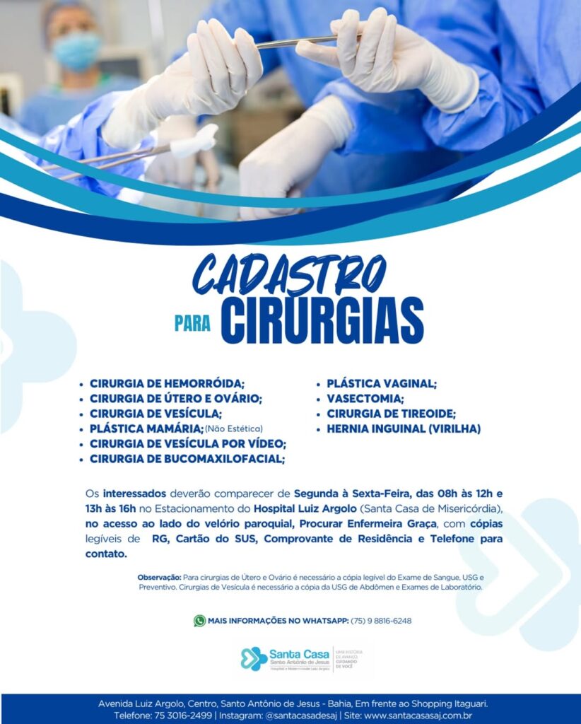 A Santa Casa de Misericórdia de Santo Antônio de Jesus iniciou o cadastramento de pacientes que desejam realizar cirurgias em diferentes especialidades médicas. Os atendimentos acontecem de segunda a sexta-feira, das 8h às 12h e das 13h às 16h, no estacionamento do Hospital Luiz Argolo, próximo ao acesso lateral do velório paroquial.
