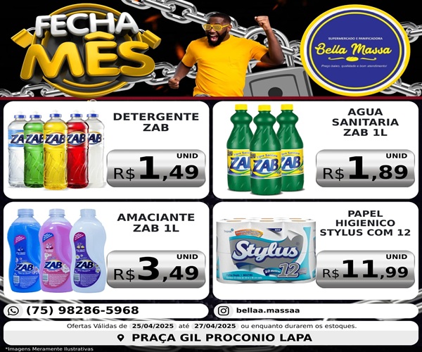 Quer economizar de verdade? Então corra para o Supermercado e Panificadora Bella Massa, onde os preços incríveis estão te esperando na promoção Fecha Mês! São ofertas imperdíveis em todos os setores.