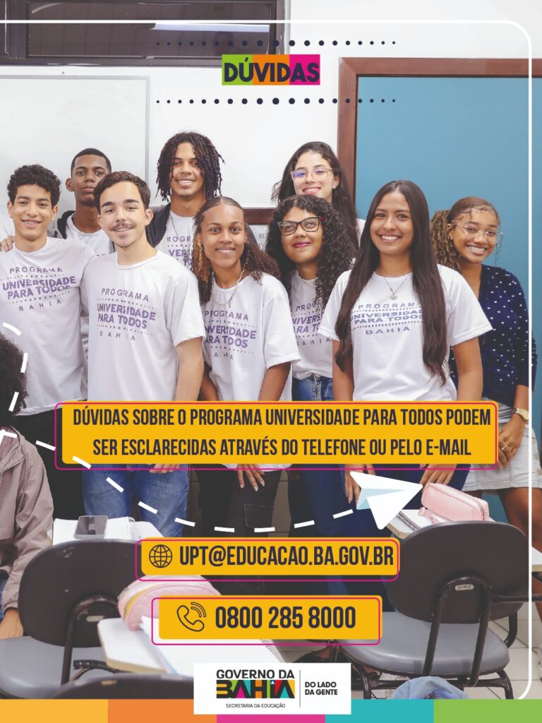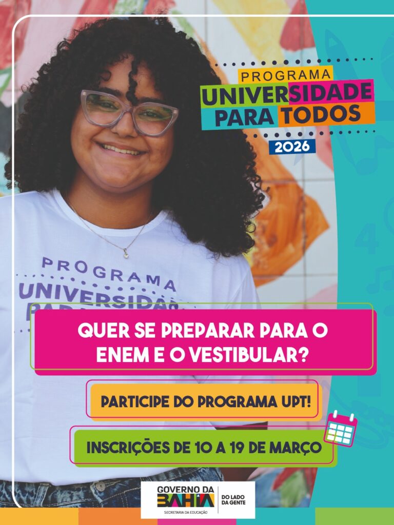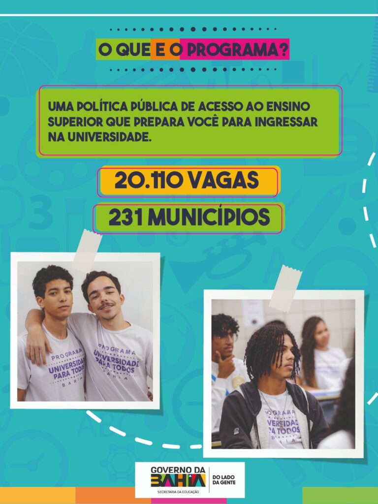 O Universidade Para Todos é desenvolvido em parceria com universidades públicas e atende estudantes em diversos municípios baianos. O cursinho oferece aulas presenciais, material de apoio e atividades de preparação para o Enem.
