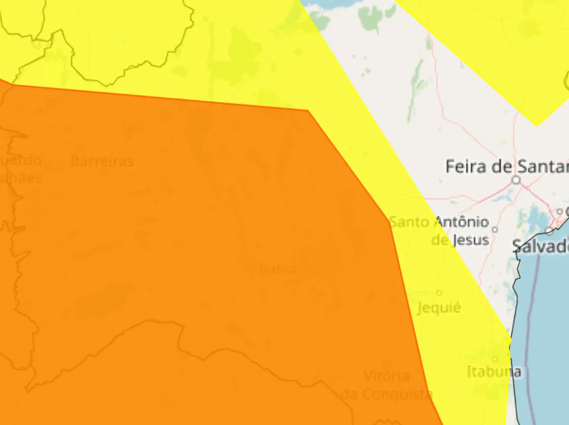 O Instituto Nacional de Meteorologia (Inmet) emitiu um alerta amarelo (de potencial perigo) para uma faixa que se estende do Sul da Bahia, passando pelo centro-sul, Vale do Jiquiriçá, Chapada Diamantina, sudoeste, Oeste e Vale do São Francisco.