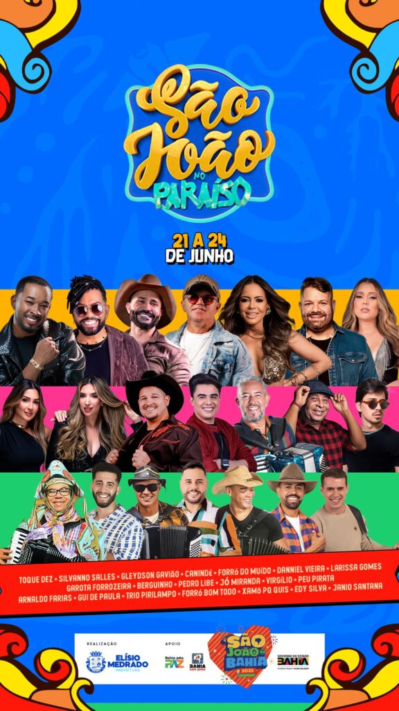 Toque Dez, Silvano Salles, Gleydson Gavião, Canindé, Forró do Muído, Danniel Vieira, Larissa Gomes, Garota Forrozeira, Berguinho, Pedro Libe, Jô MIranda, Virgílio, Peu Pirata, Arnaldo Farias, Gui de Paula, TRio PIrilampo, Forró Bom Todo, Xamô PQ Quis, Edy Silva e Jânio Santana são as atrações que compõem a grade do Arraiá no Paaraíso, o são joão de Elísio Medrado 2025.