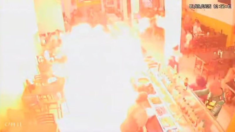 m vídeo de segurança registrou o momento exato da explosão que atingiu a Churrascaria Brasão, em Mar Grande, município de Vera Cruz, na Ilha de Itaparica, na noite de segunda-feira (15). As imagens mostram uma funcionária acendendo uma panela rechaud com álcool, quando o recipiente explodiu, espalhando chamas e provocando correria entre clientes e funcionários.